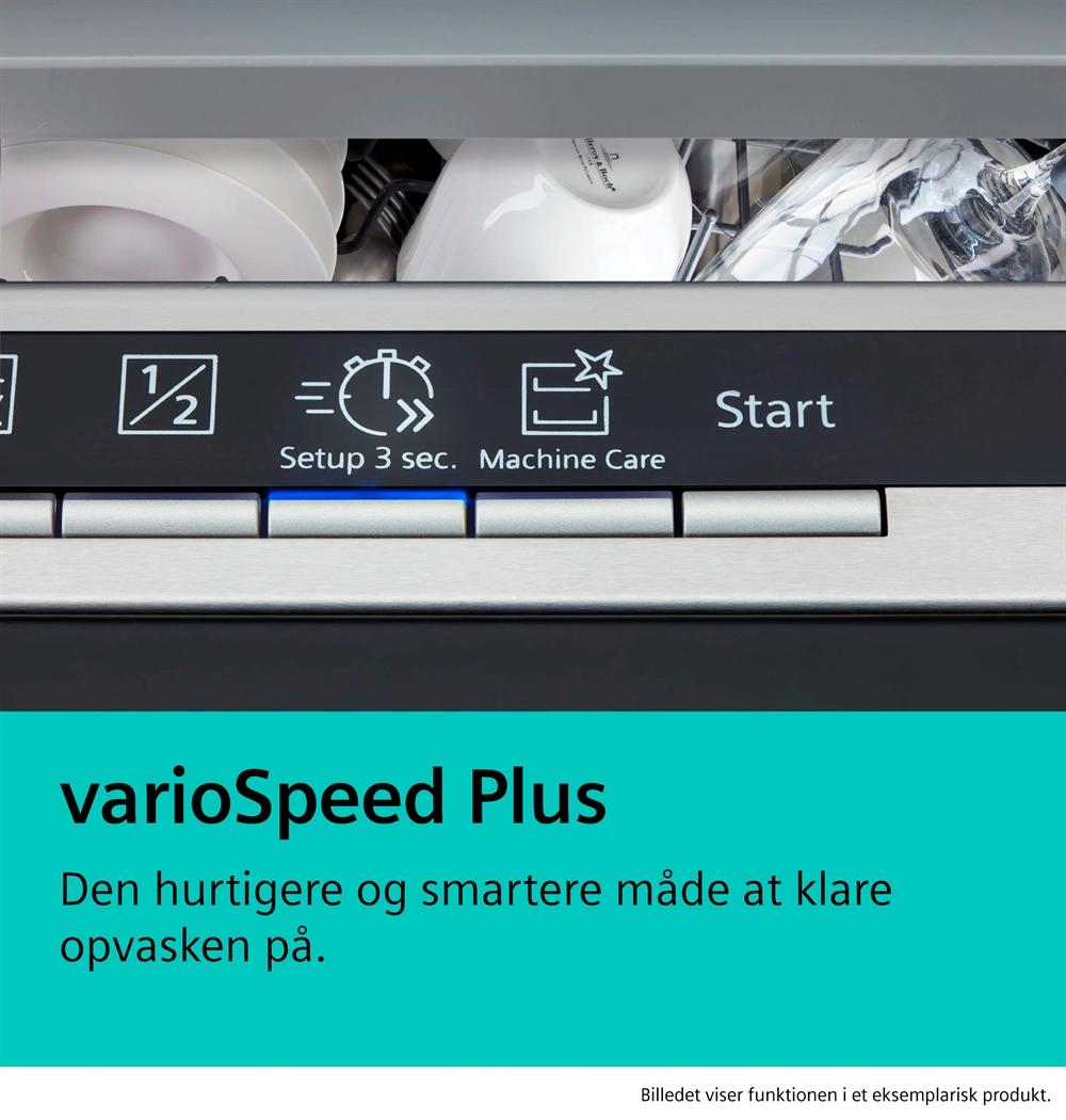 Nu kan dine tallerkener og glas både rengøres og tørres op til tre gange hurtigere end normalt, men selvfølgelig uden at gå på kompromis med det flotte resultat. Med varioSpeed Plus kan du også slå turboskyl til, selv når opvaskemaskinen allerede er i gang. Og som om det ikke var nok, kan du også tænde og styre varioSpeed Plus via Home Connect appen. Så bliver det da ikke nemmere!
