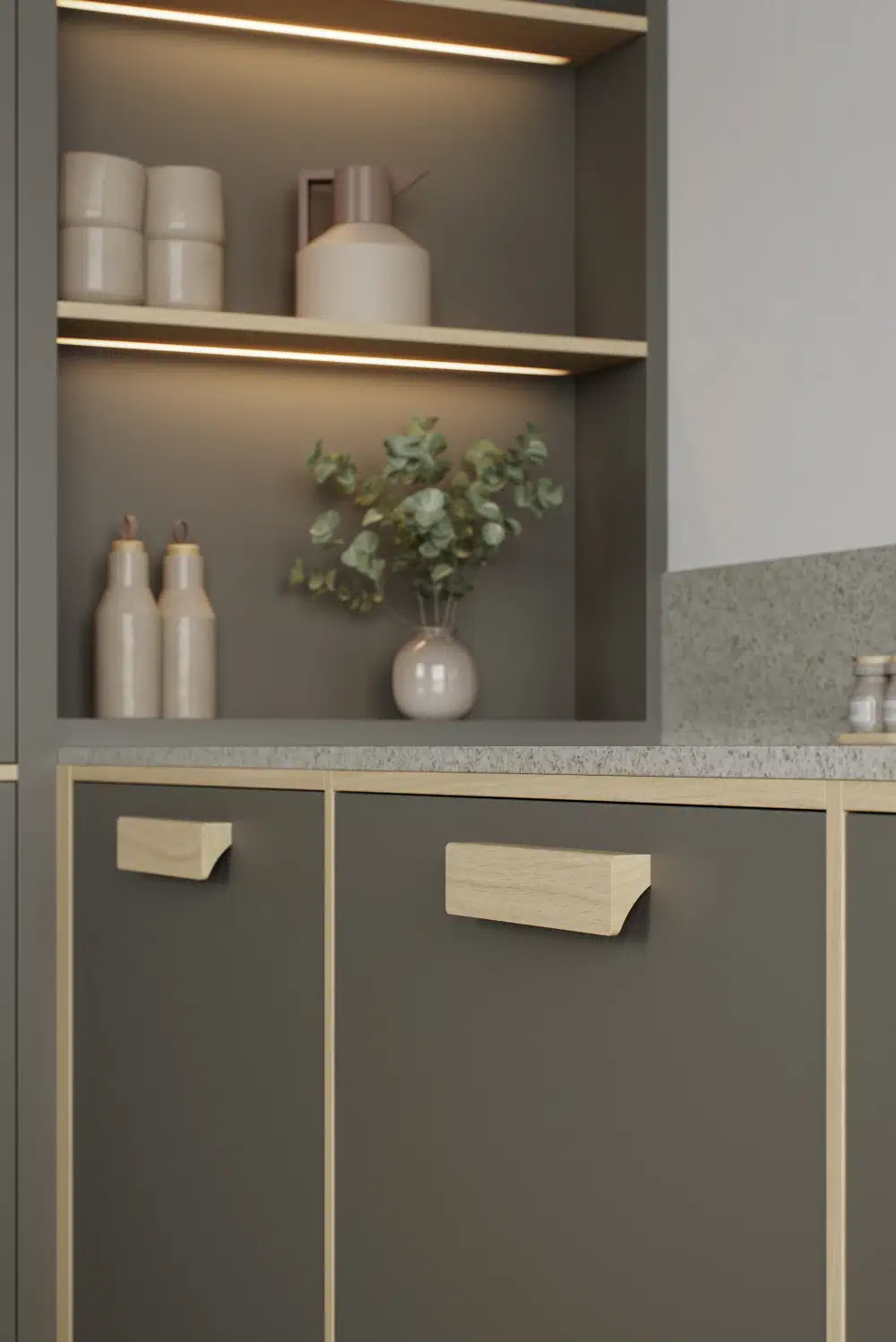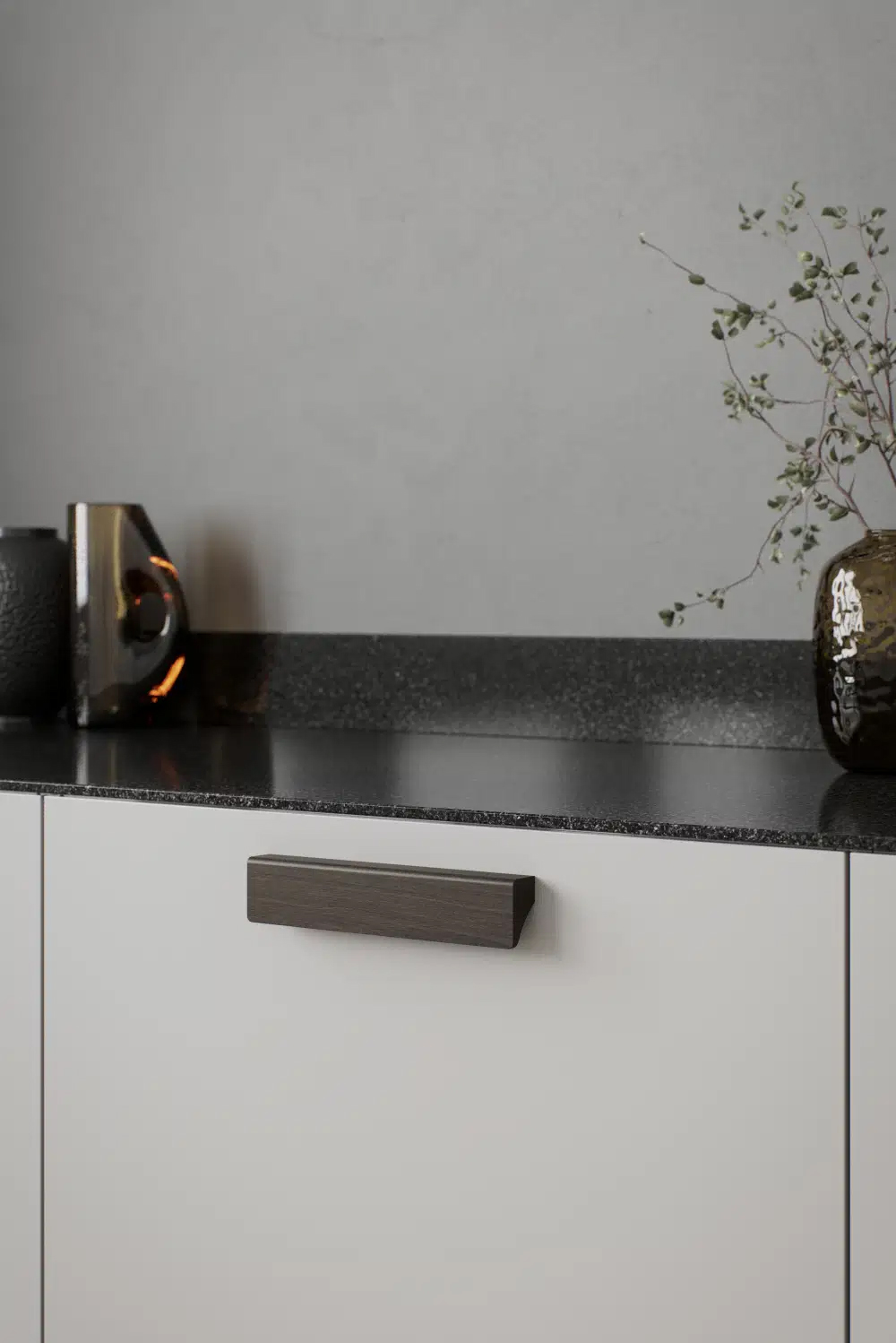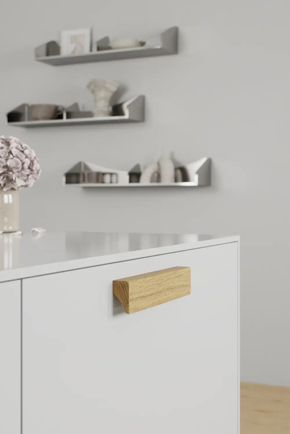 Baum udforsker balancen mellem taktilitet og form. Det blødt buede greb ligger naturligt i hånden, mens den plane frontflade lader træets naturlige struktur træde frem. Samspillet mellem stram geometri og blid formgivning giver Baum en stille styrke – en arkitektonisk tilstedeværelse med et menneskeligt præg.