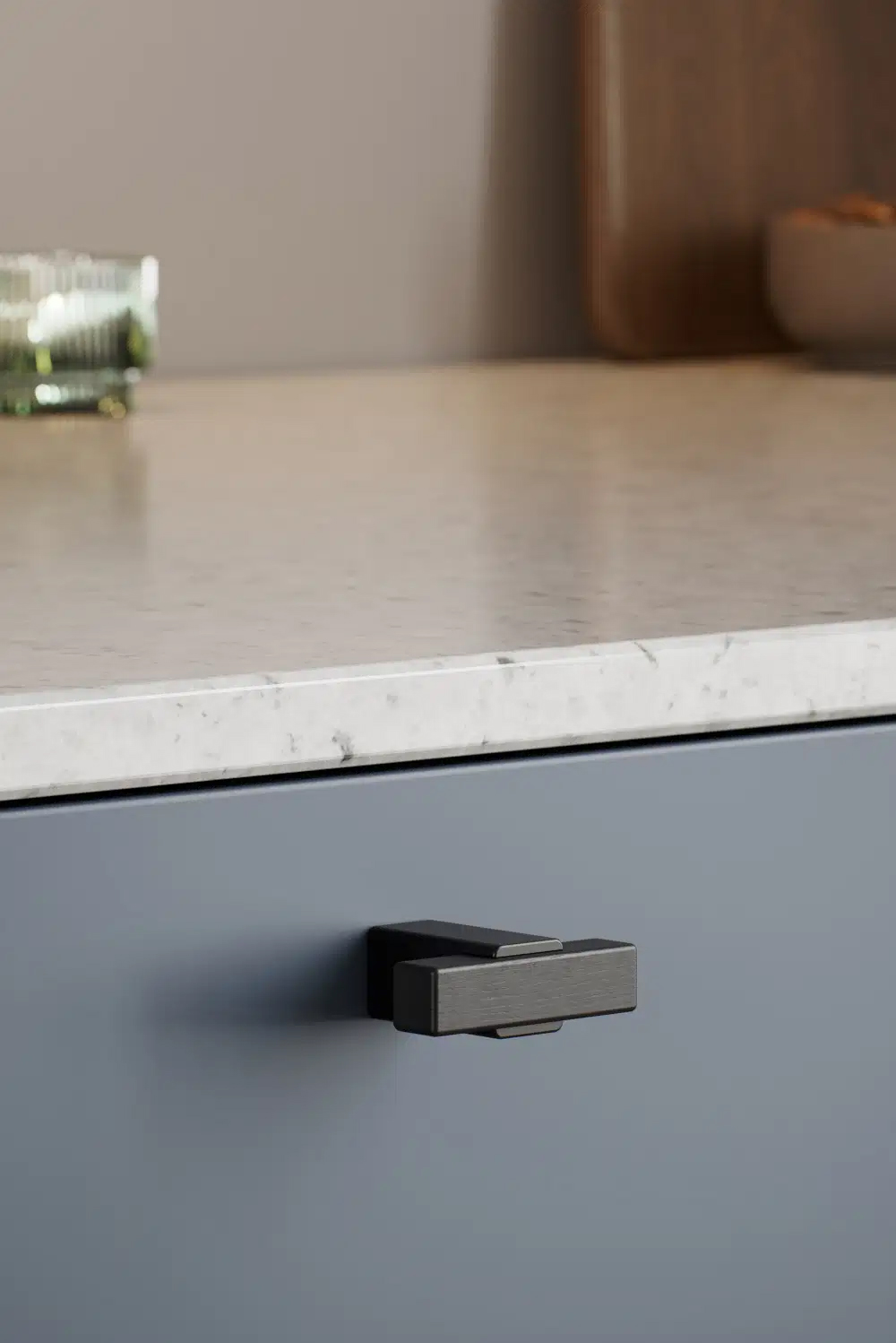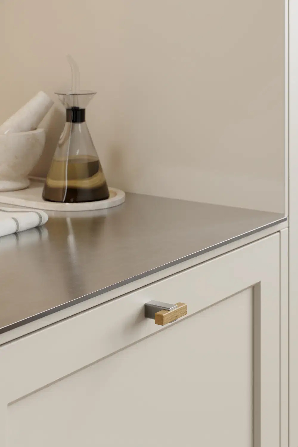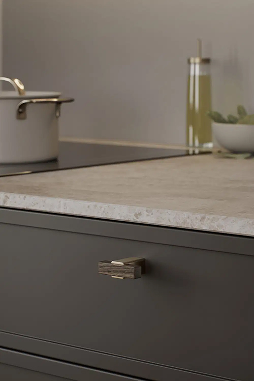 Segment skaber et segmenteret udtryk, hvor et materialeskift fremhæver grebet og giver den trædelte del en næsten ophøjet tilstedeværelse. Dette greb udtrykker styrke og elegance gennem sine støbte beslag, hvilket giver et fint og raffineret greb med en let reference til industriel design.