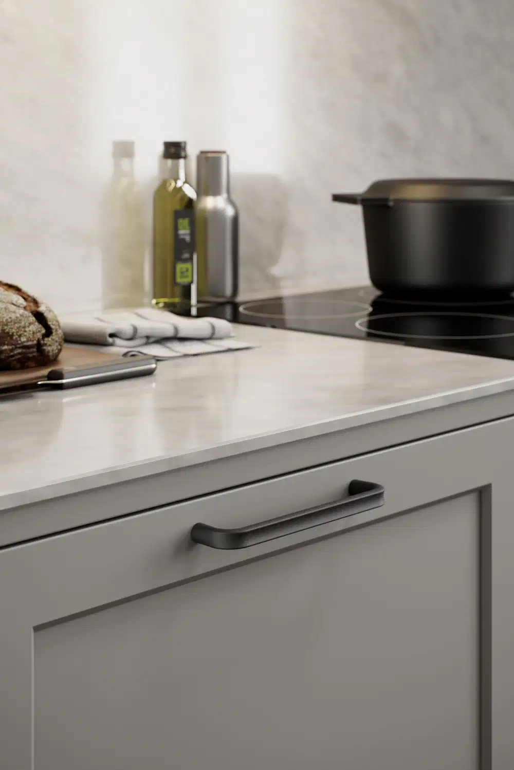 Leg med form, lys og skygge. Terra er et udtryk for disse elementer og reflekterer det dristige og dynamiske design. Den distinkte konkave front glider glat over i en cylindrisk base, hvilket skaber en følelse af flydende bevægelse. Set fra siden får grebet en konisk form med en bredere base end fronten. Dette giver det også dens karakteristiske indre vinkel, understreget af grebets lodrette ydre form. Et design, der søger en ny form, aldrig set før. Den simple detalje, der giver grebet styrke.