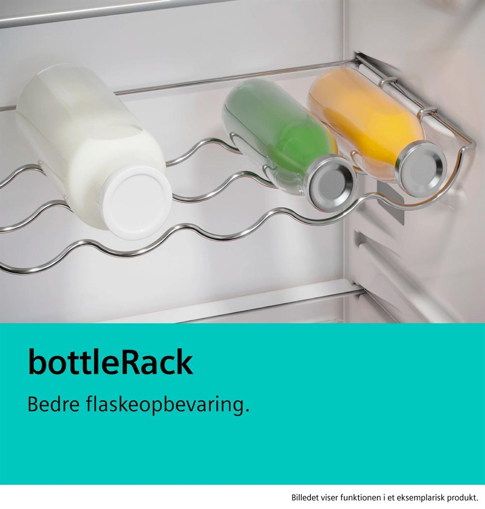 Flasker fortjener bedre opbevaringsløsninger, og det leverer vores bottleRack. Opbevar både store og små flasker sikkert og stabilt, så de ikke rasler rundt i dit køleskab. Flaskehylden holder dine flasker sikkert, men alligevel nemt tilgængelige.
