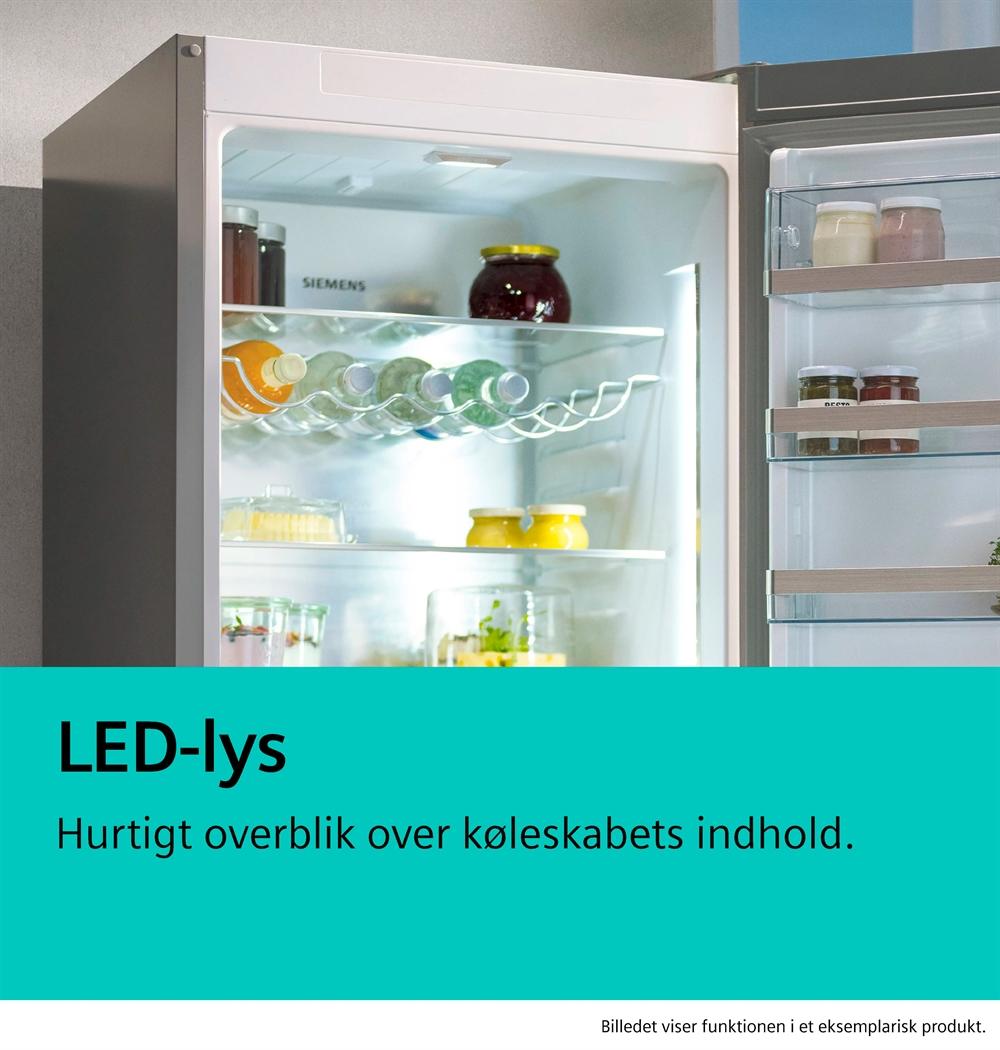 Takket være det indbyggede LED-lys er dit køleskab altid jævnt oplyst, så du hurtigt og nemt kan tjekke, hvad der er til frokost.Da lysene er monteret foran på køleskabet, forhindrer køleskabets indhold ikke lyset i at nå ud til alle hjørner.Og så holder LED-lys desuden længe og er meget energieffektive.