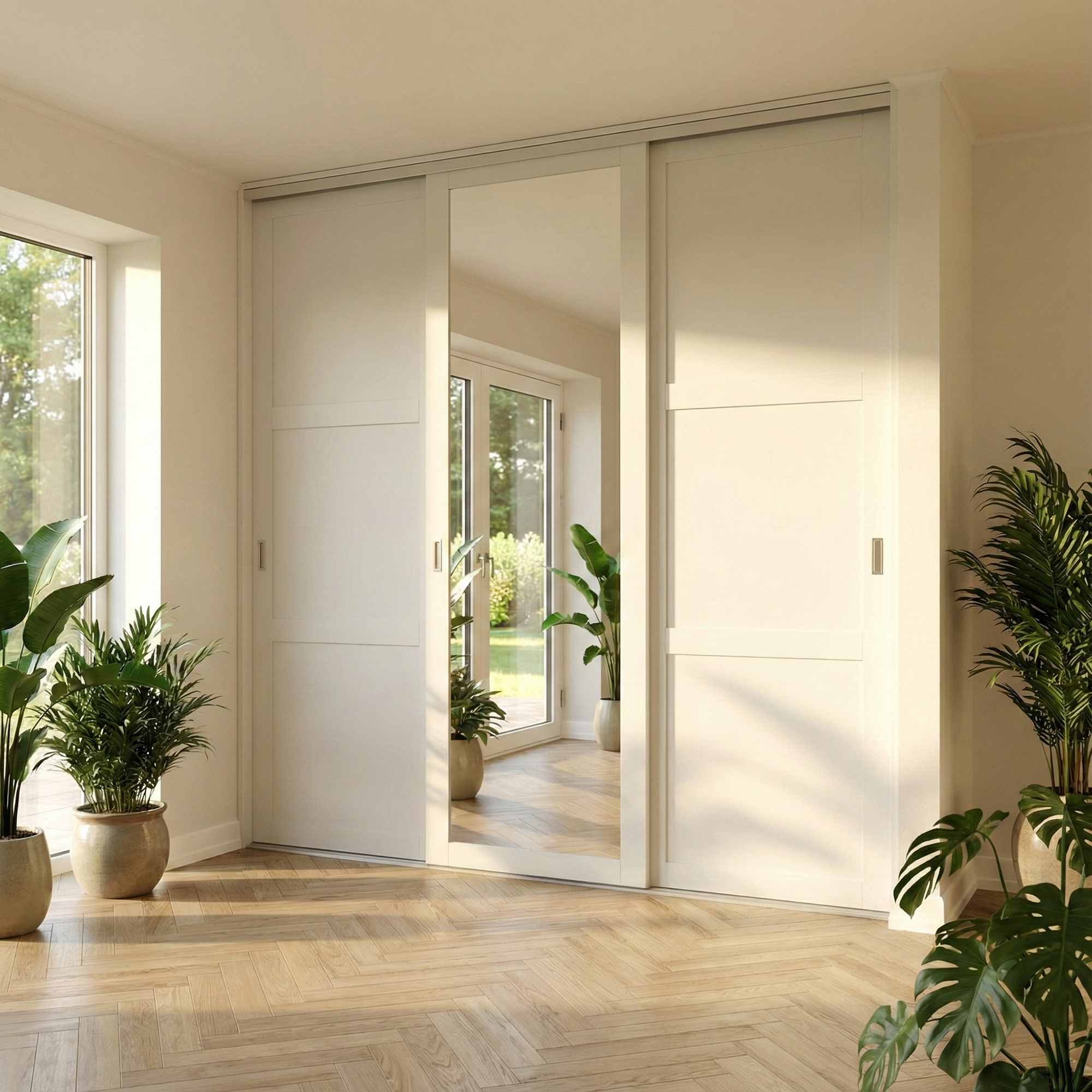 3 skydelåger fra bredde 232 - 291cm. Prisen er inklusiv skinnesæt og beslagskasse.